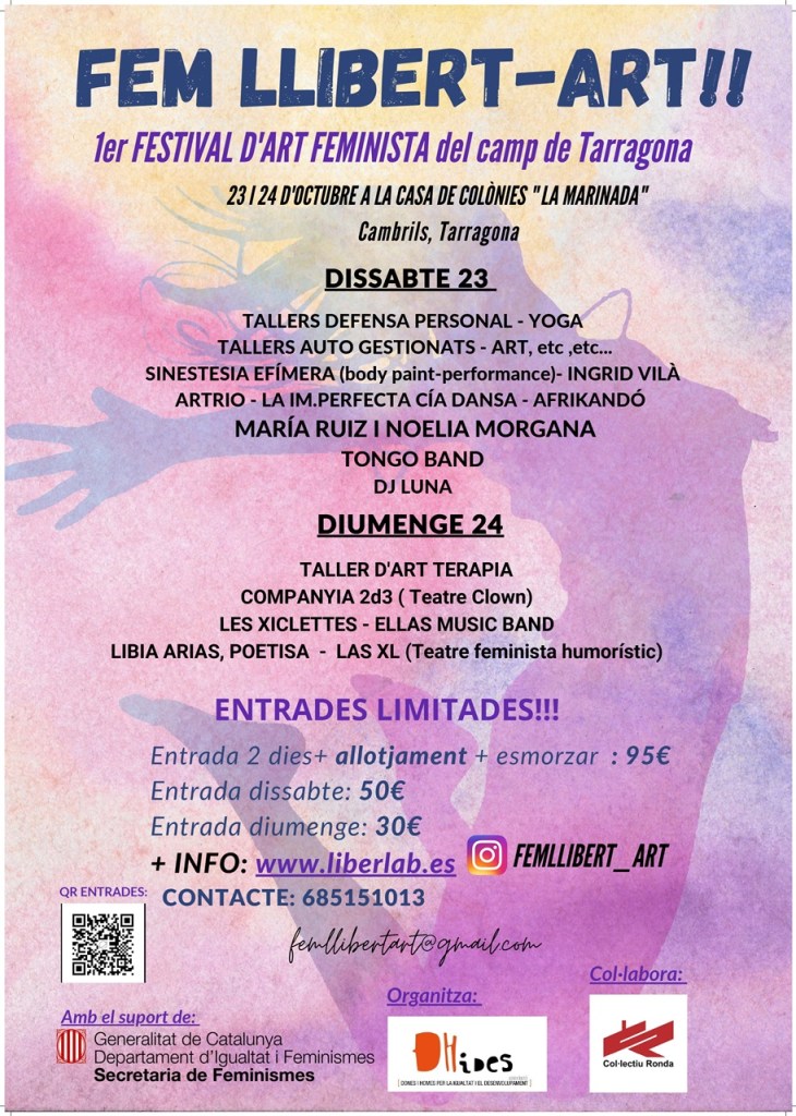 Este fin de semana tendrá lugar en Tarragona el Festival Fem Llibert-Art, que «surge de la idea de compartir un espacio innovador, donde vivir y sentir la libertad desde el cuestionamiento de los dogmas y condicionamientos sociales que nos oprimen. Un espacio donde disfrutar, compartir, reflexionar, aprender y llevarnos todo lo vivido a nuestros espacios vitales para transformar el mundo desde lo personal, sabiendo que somos muchas las personas que desobedecemos el orden establecido porque obedecerlo significa seguir reproduciendo desigualdades.
